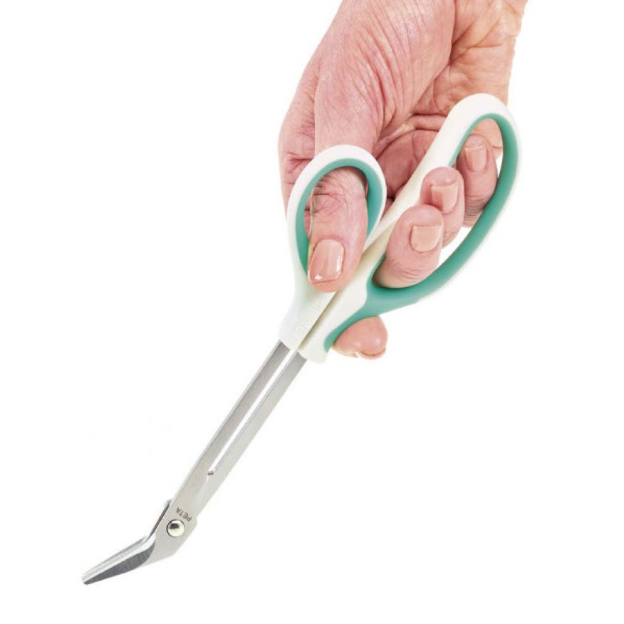 Con grandes asas que permiten utilizar toda la mano para controlar mejor la tijera. La tijera es extralarga para los que tienen dificultad en agacharse. Las cuchillas curvadas de acero inoxidable ofrecen una buena posición para cortar. La cuchilla superior está ligeramente dentada para que no se resbale en la uña.